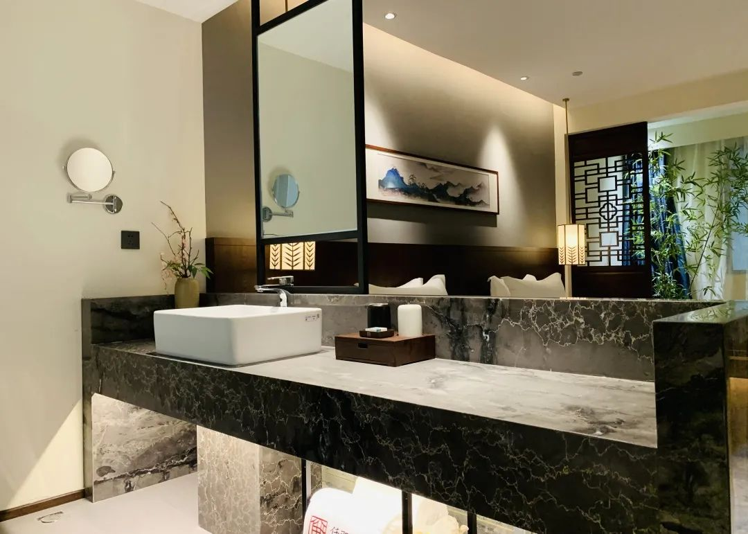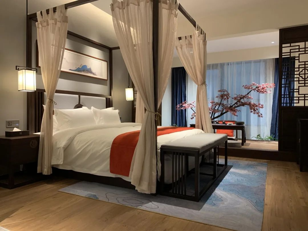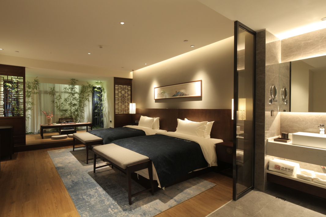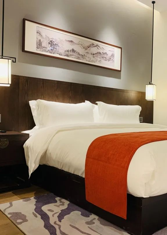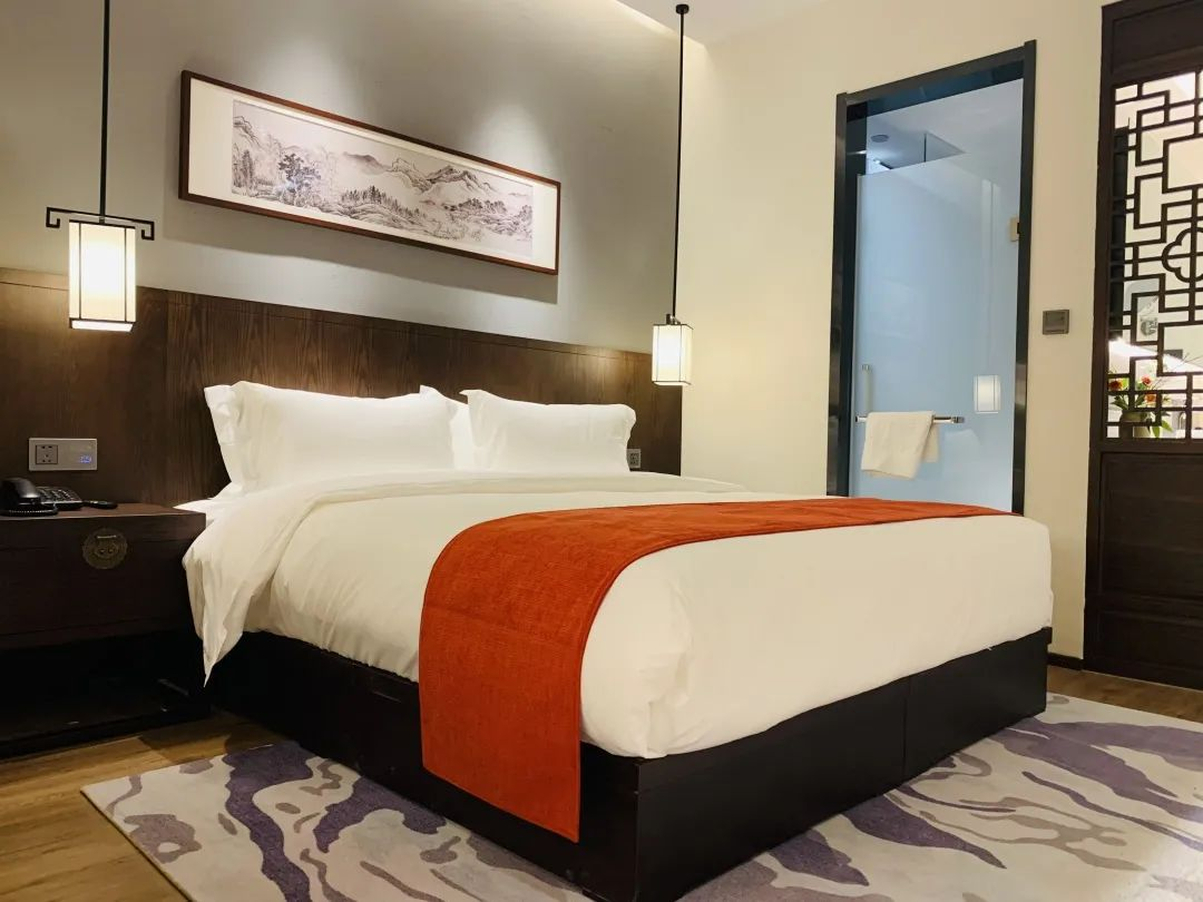 酒店客房的设计旨在营造一个纯情本真、文雅精致、简朴高远、云淡风轻的自然环境。把文人雅客喜欢的山水竹林景观搬进客房中再搭配木制家具,出色地营造出一派古今结合的古朴清新。