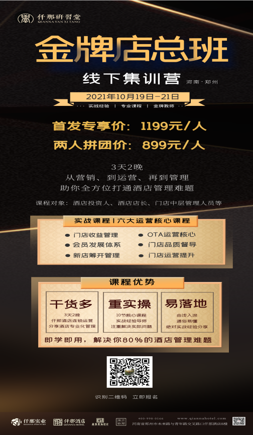 培训对象:酒店老板、店长、前厅经理、线上运营等